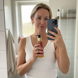 July 2025Silje R.Verified BuyerI actually wanted photos in my bikini.This is me on vacation! Finally in a bikini after four kids — I feel so much more confident since I started using the oil. It's so luxurious and makes me feel like a queen!